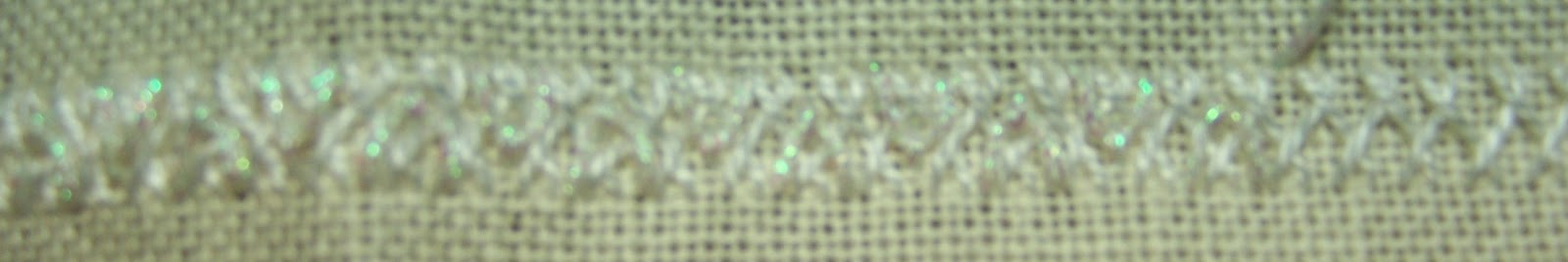 I know it is hard to see. I may try again with the camera. What you are looking at is a herringbone base done in perle cotton #8 which is 2 threads "wide" and 8 threads "high". You can see that on the right side of the picture. Then a fly stitch is done over the top of the herringbone with Krenik braid #16 in 032. The fly stitch is supposed to glint like snow on the roof. The #16 is really too heavy for this fabric, but I wanted the snow to show up.